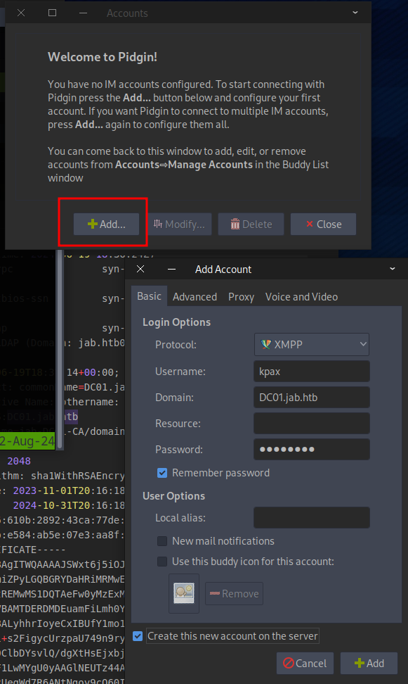 Install the Pidgin program, so we can connect with the XMMP server found during the Nmap scan.