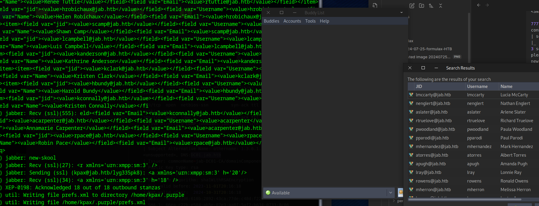 Log into Jabber using Pidgin as jmontgomery user Open Room about Pen Test Find Password to svc_openfire user
