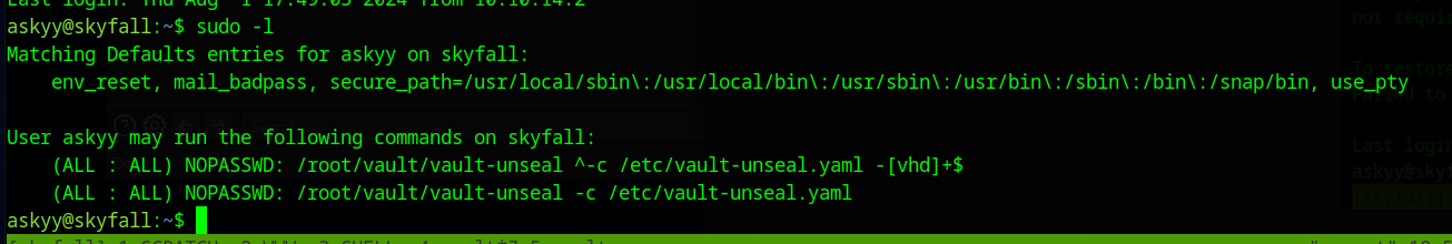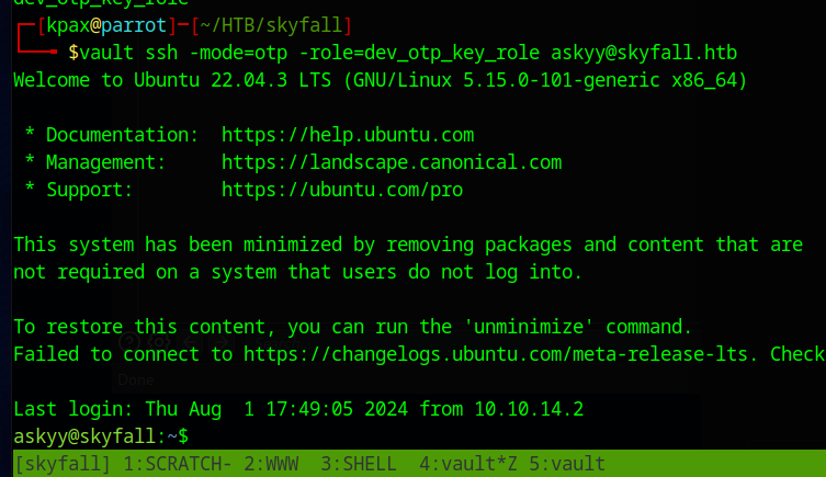 vault ssh -mode=otp -role=dev_otp_key_role askyy@skyfall.htb