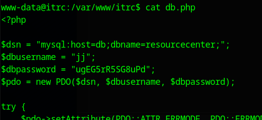 We get some creds from db.php in the /var/www/itrc/ directory, these can be used to connect to the Database.
