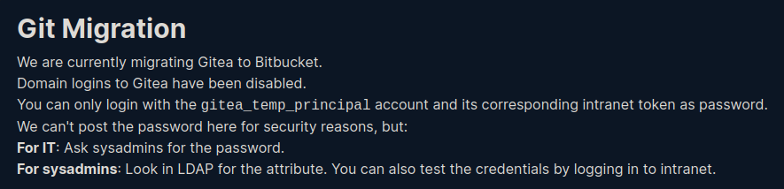 It says we can only login using the gitea_temp_principal user. It also says we can test the credentials by using the intranet login. This means we can use the wildcard trick to leak the password of the gitea_temp_principal user.