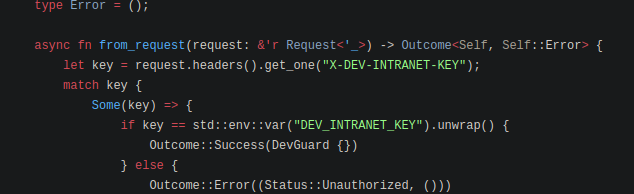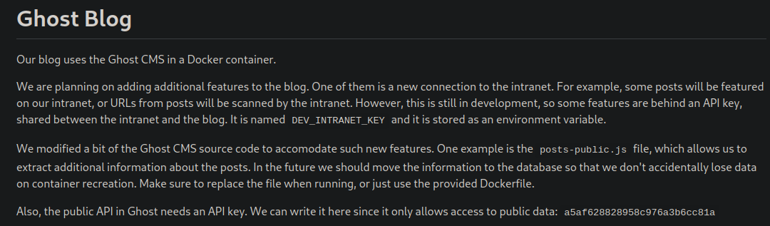 This means, that if we use the API key mentioned in the gitea repo and a extra variable set to a file that exists, we can output the contents of that file. We can use an LFI in this code to leak the environment variables of the running process and steam the DEV_INTRANET_KEY