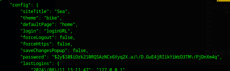 Within /var/www/sea/data/database.js is a hashed password. The password is escaping the forward slashes, so you have to remove the escapes to crack with hashcat.