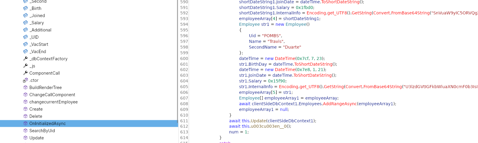 We then decode the DLL with CodemerxDecompile and in the OnInitalizedAsync function we find a number of base64 blobs.