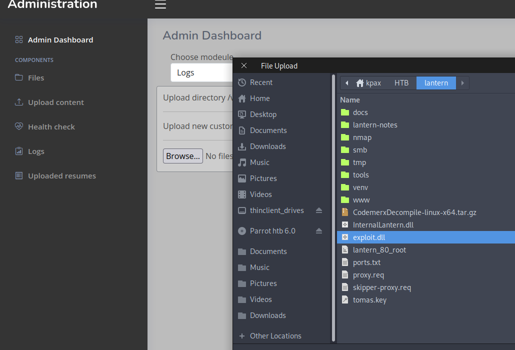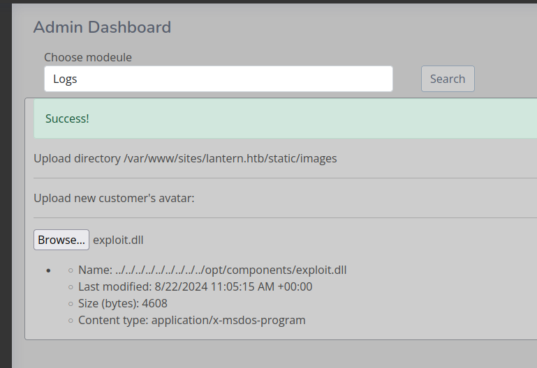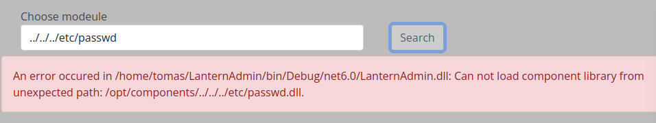 If we try a LFI in the search box then we get this error message. So it seems that if we can get a dll onto the box, then this may be able to execute it. We also leak tomas’ home directory and the dotnet version being used to run LanternAdmin.dll