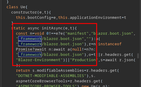 We can use burp to retrieve this file and searching in this file for more _framework references, we find reference to a blazor.boot.json