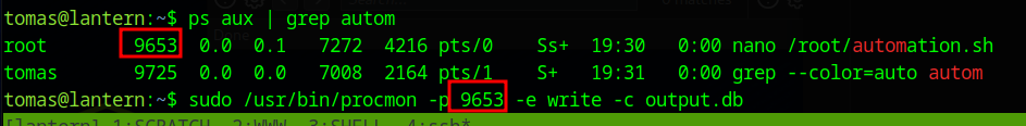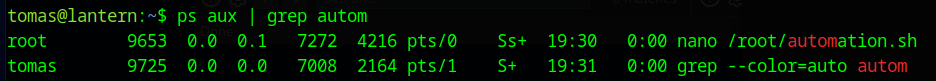 The /root/automation.sh file can be found in the process tree being edited in nano.