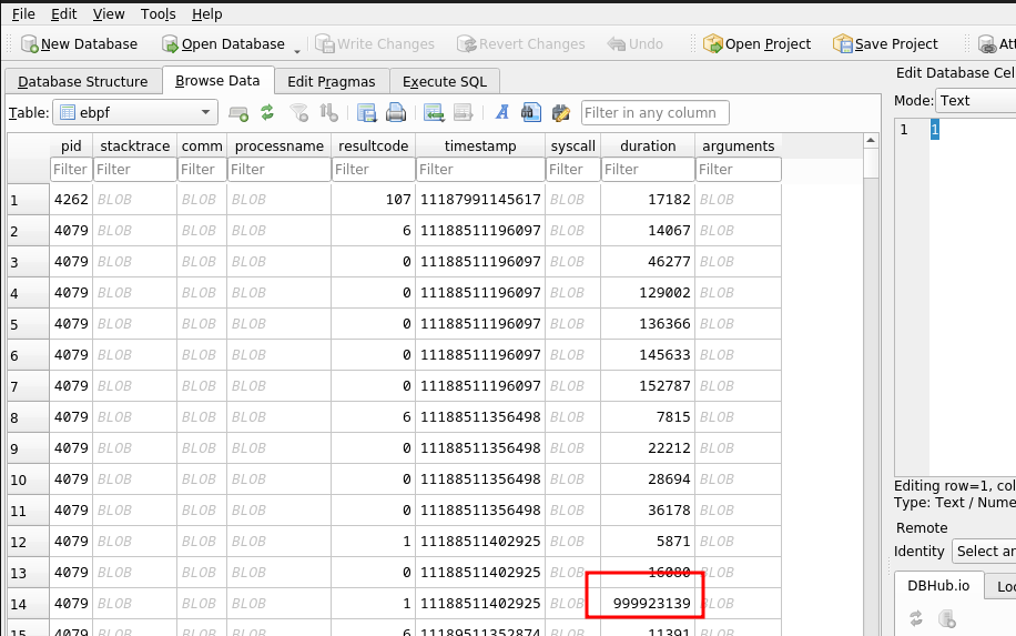 We set the -p flag to the Process ID of the nano process, then the -e flag to write and the -c flag to output.db, which will generate a SQLite3 Database of the results.
