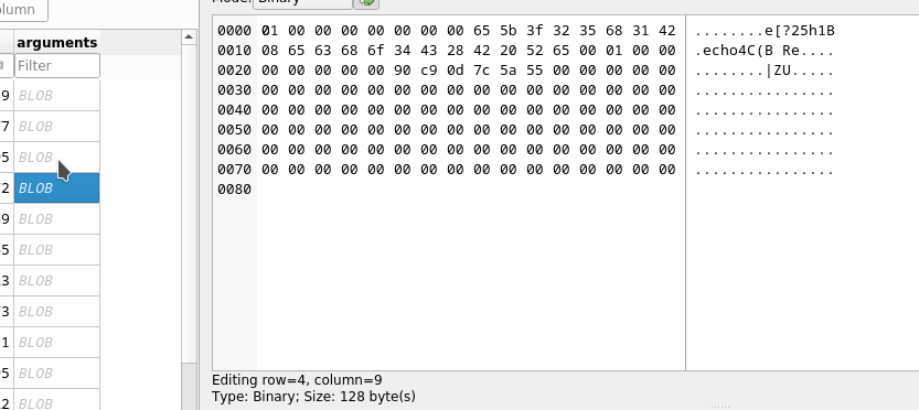 By filtering the results to durations that are over 900,000 we can see a pattern emerging in the arguments BLOB field.