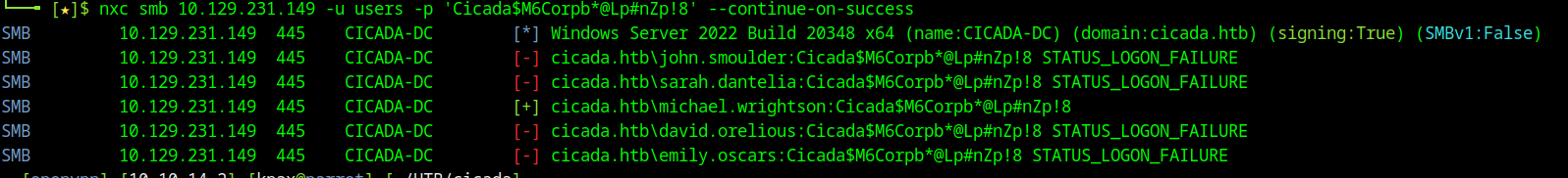nxc smb 10.129.231.149 -u users -p 'Cicada$M6Corpb*@Lp#nZp!8' --continue-on-success