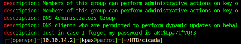 ldapsearch -x -H ldap://10.129.231.149 -D 'CICADA\michael.wrightson' -w 'Cicada$M6Corpb*@Lp#nZp!8' -b "DC=cicada,DC=htb" | grep desc