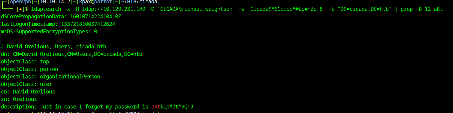 ldapsearch -x -H ldap://10.129.231.149 -D 'CICADA\michael.wrightson' -w 'Cicada$M6Corpb*@Lp#nZp!8' -b "DC=cicada,DC=htb" | grep -B 12 aRt