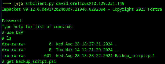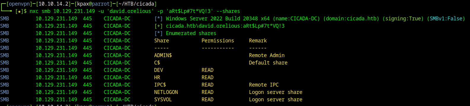 nxc smb 10.129.231.149 -u 'david.orelious' -p 'aRt$Lp#7t*VQ!3' --shares
