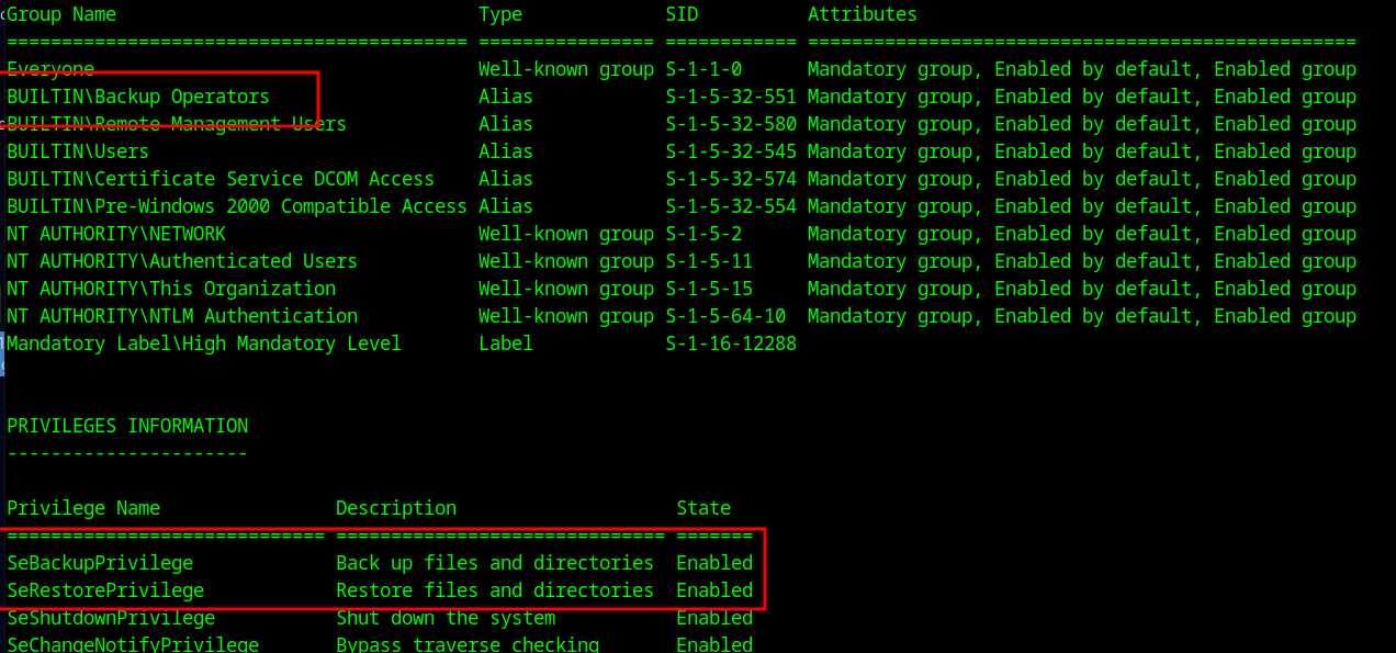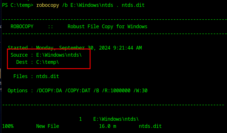 This means we can backup the C: drive and get access to the NTDS file to export the hashes from the box, offline.