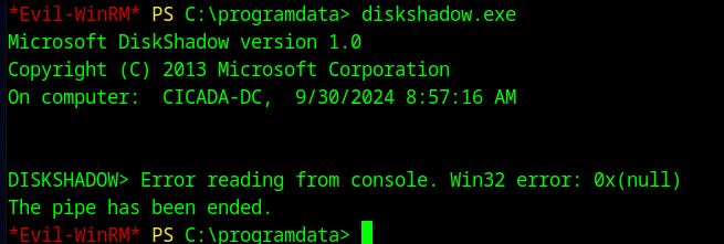 diskshadow won’t run from evil-winrm, so we need a better shell.