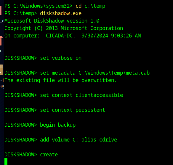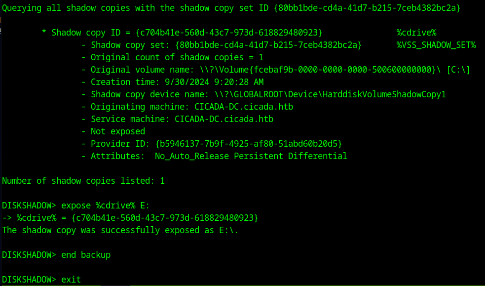 Next we can use the instructions here to use diskshadow.exe to get the same results.